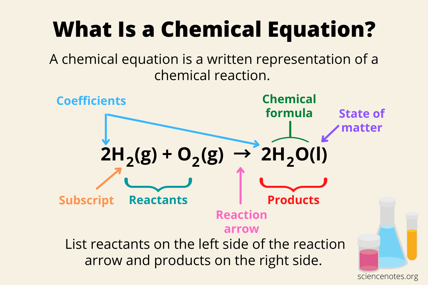 - When balancing equations, you can't change the subscript numbers or insert numbers into the middle of a formula; you can only add or alter numbers in front of the formula.