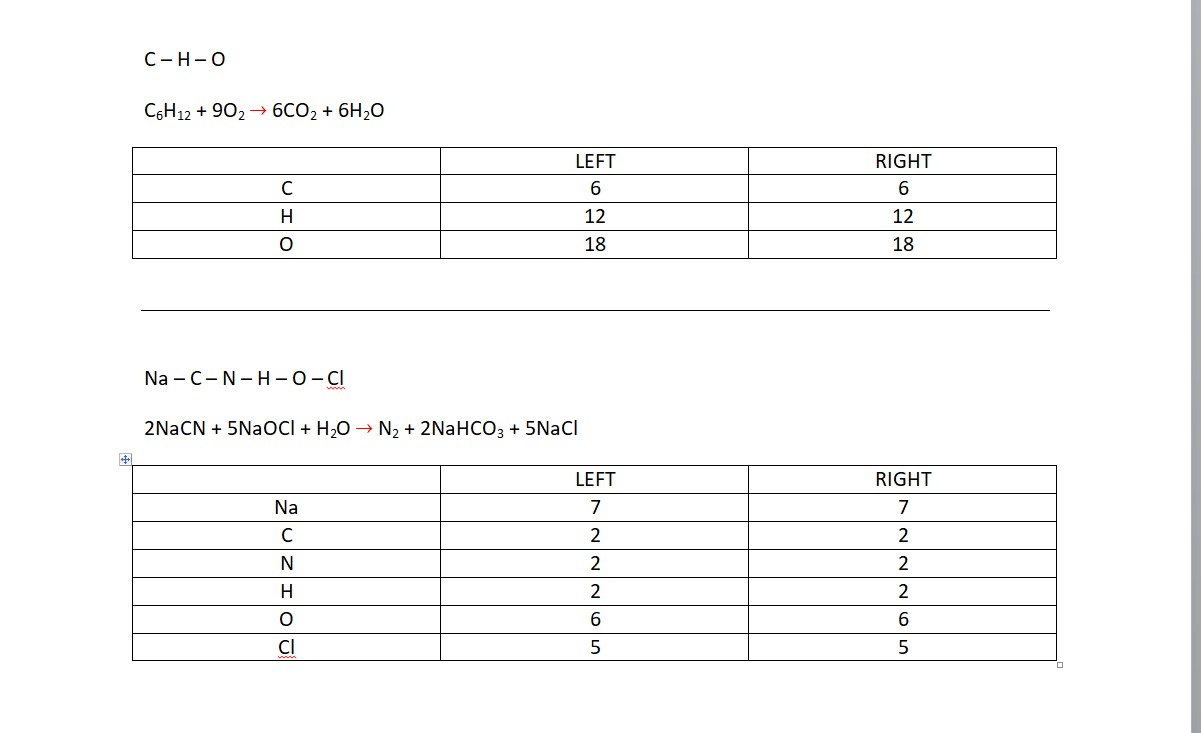 - Draw up a table showing how much of each element there is on each side of the equation.