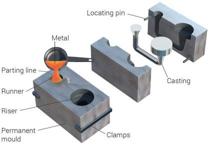 This process is similar to sand casting except that the mould is cut from solid metal, usually cast iron or steel. Similar to sand casting, the liquid metal is poured in through the ‘runner’ and flows down into the mould cavity. The runners, where fluid is poured in, and risers, which fill with excess fluid once the cavity is full, also act as resovoirs of liquid to top up the casting as the metal contracts on cooling.
