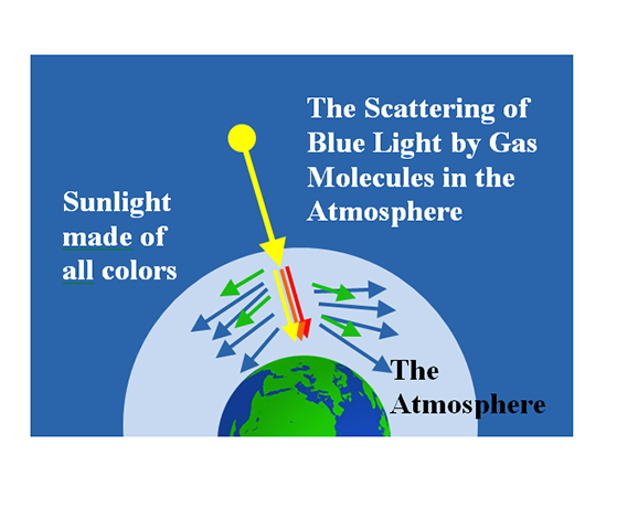 Blue light scatters in the Earths atmosphere because it has a higher frequency, and therefore strikes more particles as it passes through the atmosphere, making the blue light ‘scatter’ more, making the sky look blue.
